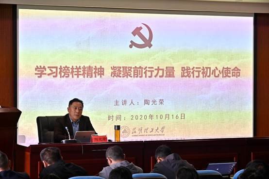 10月16日上午,陶书记作了《学习榜样精神 凝聚前行力量 践行初心使命》的党课,他围绕学习优秀共产党员、全国模范教师张桂梅的先进事迹,深刻阐述了张桂梅的动力源是什么?张桂梅精神的本质是什么?如何践行张桂梅精神等三个方面的问题。陶书记勉励大家要深入学习张桂梅坚守初心、对党忠诚的崇高品格,爱岗敬业、爱生如子的高尚师德,执着奋斗、无私奉献的至诚情怀。要求师生党员联系各自工作学习的实际,以榜样的力量为指引,学习贯彻习近平总书记系列重要讲话精神特别是对云南工作的指示批示,加强思想修养,坚定理想信念,切实坚定“四个自信”,增强“四个意识”,坚决做到“两个维护”。要求学院党政班子加强团结,以共产党员的初心和担当,凝聚全院师生的智慧和力量,共同推动学院高质量发展。