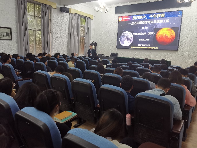最后,中国地质大学(武汉)肖龙教授做了题为“嫦娥揽月,天问探火:走进中国的月球和火星探测工程”的报告,介绍了全球深空探测计划的技术和科学研究相关知识,并重点回顾了我国的月球、火星探测历程,特别是嫦娥五号成功登月采样和返回的全过程,展望了我国深空探测的未来。