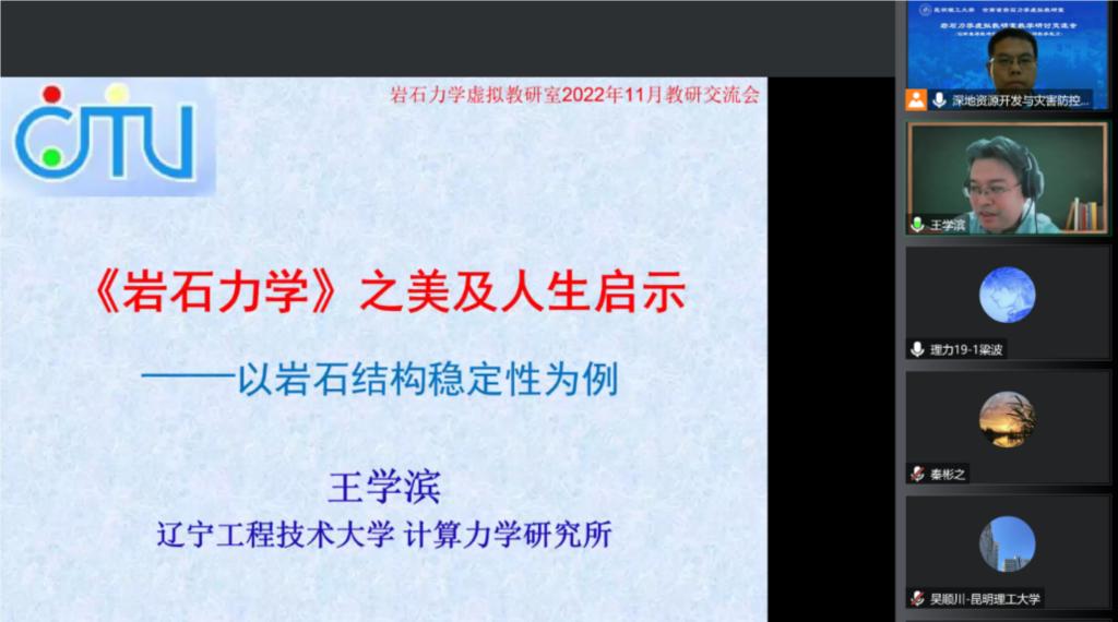吴顺川教授牵头建设的云南省岩石力学虚拟教研室2022年11月教研交流会通过线上方式召开,辽宁工程技术大学王学滨教授受邀作了题为《<岩石力学>之美及人生启示——以岩石结构稳定性为例》的交流报告,全国267名教师和部分学生参加了交流会。交流会由王超副教授主持。