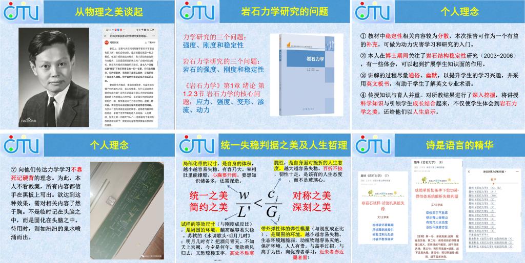 王学滨老师从物理之美谈起,引出了岩石力学研究中的三个问题,结合岩石结构稳定性的教学内容,分享了自己总结的7条教学理念,并介绍了在讲解岩石结构稳定性时使用的巧妙先进的教学方法和手段。王老师的交流内容丰富具体、诙谐幽默,富含课程思政育人元素,撰写的诗句生动形象、契合课程主题,整场报告具有很强的启发性。