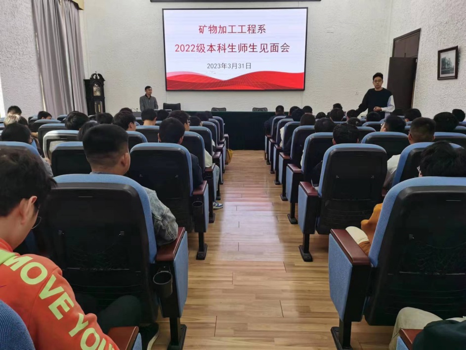 矿物加工工程专业2022级本科新生于3月31日下午,在1号楼第一会议室召开师生见面会暨双选会。学院副院长蓝卓越、矿物加工工程专业主任高利坤、矿物加工工程专业各专任老师参会,会议由矿物加工工程专业副主任章晓林老师主持。