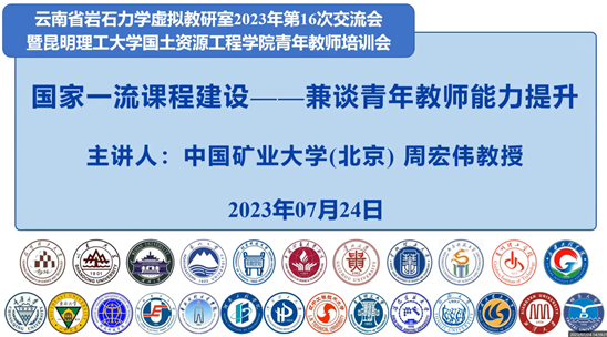 7月24日下午15:00~17:00,云南省岩石力学虚拟教研室2023年第16次交流会暨国资学院青年教师培训会召开,国家级教学名师、中国矿业大学(北京)周宏伟教授受邀作了题为《国家一流课程建设——兼谈青年教师能力提升》的交流报告,全国1200余名教师通过腾讯会议或视频直播方式参会。交流会由国资学院党委书记朱大明主持。