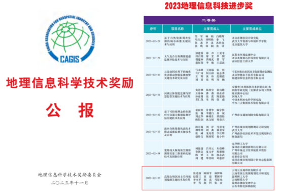 作为主要参与单位,与云南云金地科技有限公司、云南省国土资源规划设计研究院等5家单位联合申报的“高原山坝区国土空间规划编制关键技术及应用”荣获“地理信息科技进步二等奖”。