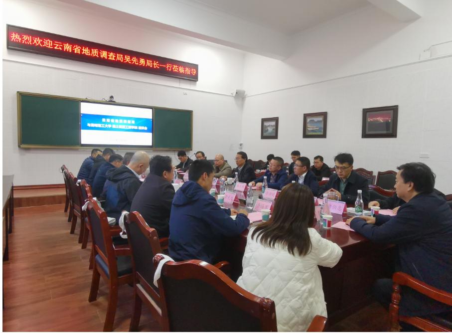 学科发展进展、学院与云南省地质调查局在新一轮找矿行动、云南省自然灾害治理与防治方面的合作成效。云南省地质调查局党委副书记、局长吴先勇介绍了单位情况,对两家单位在自然资源部三江成矿作用及资源勘查利用重点实验室、高原山地地质灾害预报预警与生态保护修复重点实验室建设的合作成效给予了充分肯定。在充分交流的基础上,双方达成共识,明确今后进一步加强科技合作,发挥各自优势,不断拓展和深化在新一轮找矿行动、云南省地质灾害防治和治理方面的合作。